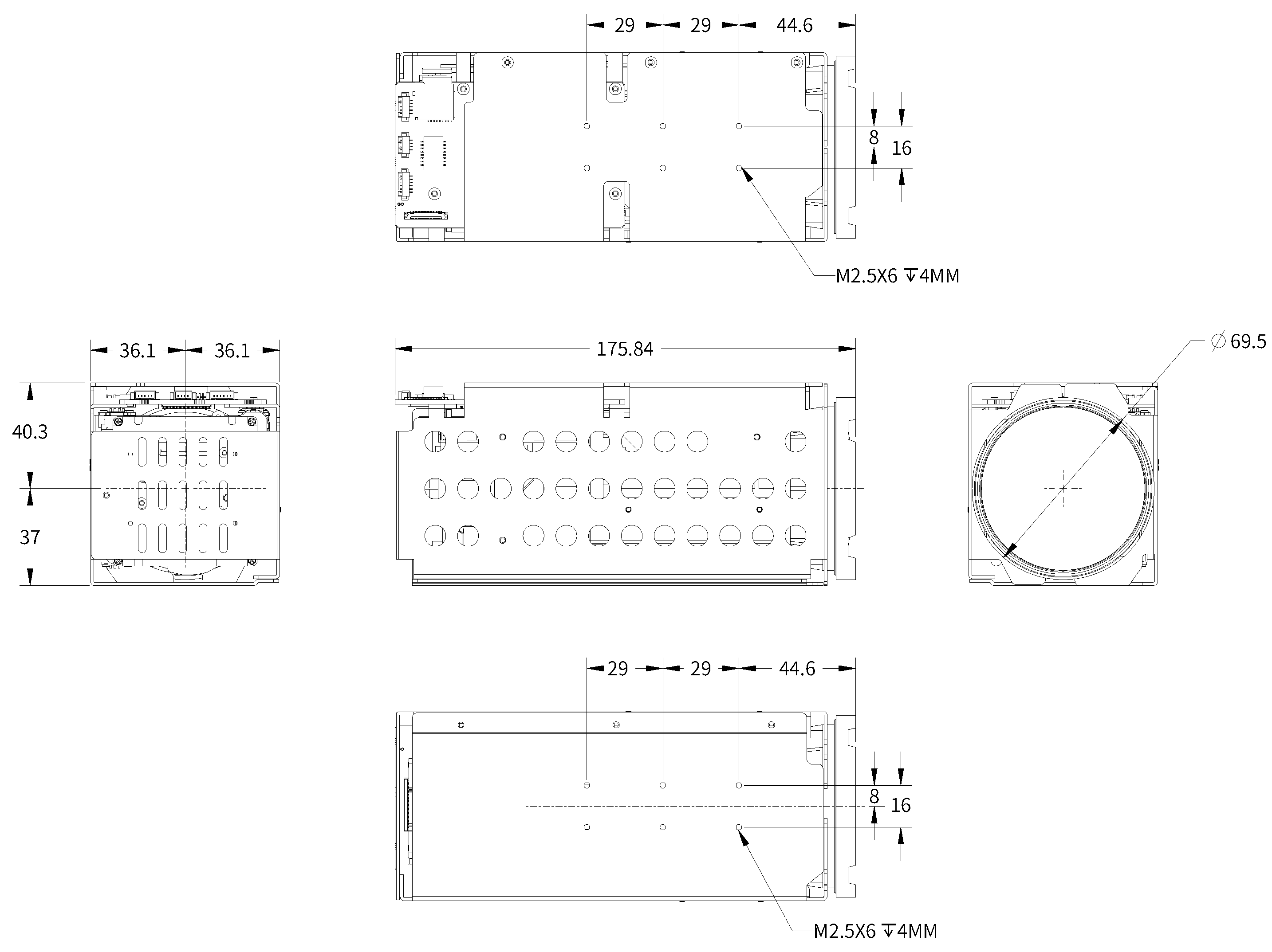 4pin ईथरनेट पोर्ट, 6pin पावर और UART पोर्ट, 5pin ऑडियो पोर्ट। 30pin Mipi |